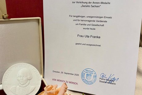 Für ihren „langjährigen, uneigennützigen Einsatz und für hervorragende Verdienste um Familie und Gesellschaft“, so Sachsens Sozialministerin Petra Köpping, wurde Ute Franke am 29. September 2025 im Festsaal von Schloss Albrechtsberg die Annen-Medaille verliehen. Diese Medaille aus Meißner Porzellan wird seit 30 Jahren von der Sächsischen Staatsregierung zum Andenken an die wohltätige Kurfürstin »Anna von Sachsen« (1532–1585) gestiftet.